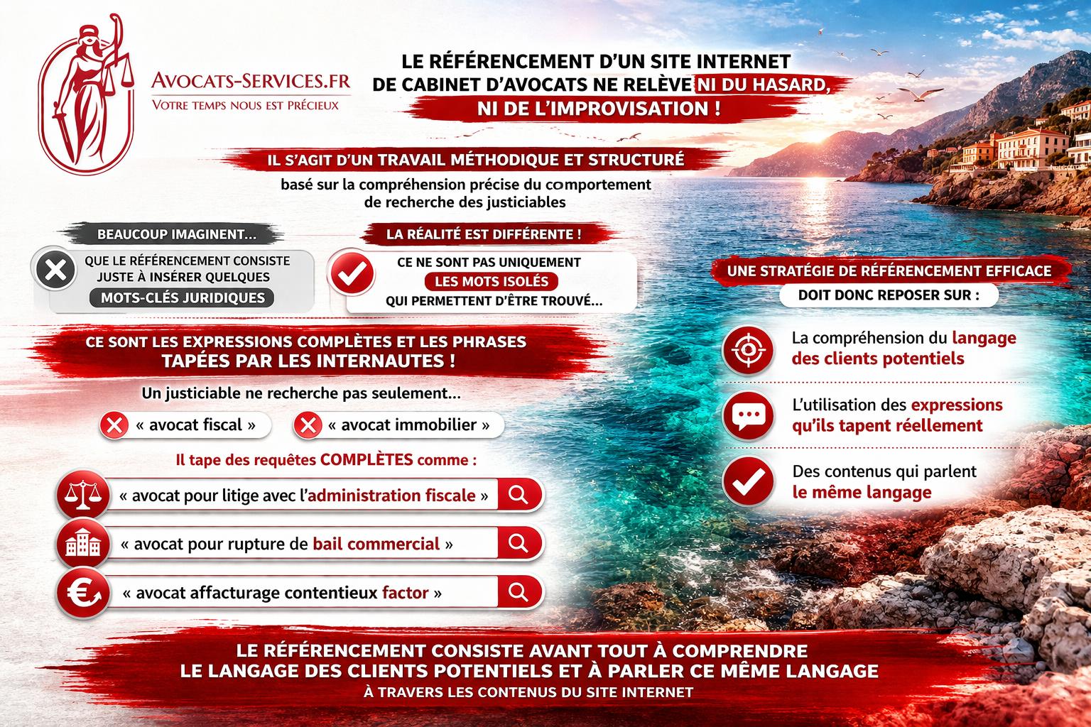 Le référencement d’un site internet de cabinet d’avocats ne relève ni du hasard ni de l’improvisation. Il s’agit d’un travail méthodique, structuré, reposant sur une compréhension précise du comportement de recherche des justiciables. Beaucoup imaginent que le référencement consiste simplement à insérer quelques mots-clés juridiques dans un site internet. La réalité est bien différente. Ce ne sont pas uniquement les mots isolés qui permettent d’être trouvé sur les moteurs de recherche, mais surtout les expressions complètes et les phrases réellement tapées par les internautes. Un justiciable ne recherche pas seulement « avocat fiscal » ou « avocat immobilier » ; il tape le plus souvent des requêtes complètes telles que « avocat pour litige avec l’administration fiscale », « avocat pour rupture de bail commercial », ou encore « avocat affacturage contentieux factor ». C’est précisément sur ces expressions concrètes que doit se construire une stratégie de référencement efficace. Le référencement consiste donc avant tout à comprendre le langage des clients potentiels et à parler ce même langage à travers les contenus du site.