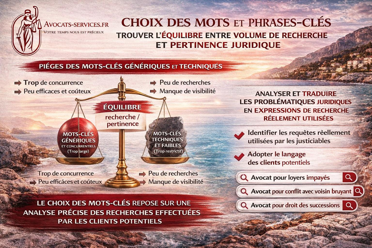Le choix des mots et des phrases clés constitue ainsi l’étape la plus déterminante d’une stratégie de référencement. Des mots-clés trop génériques sont généralement très concurrentiels et peu efficaces, car de nombreux cabinets cherchent à se positionner dessus. À l’inverse, des mots-clés trop techniques ou trop rares ne génèrent que très peu de recherches et donc très peu de visibilité. Tout l’enjeu consiste à trouver un équilibre entre volume de recherche et pertinence juridique. C’est pourquoi il est indispensable d’identifier les requêtes réellement utilisées par les justiciables, et non celles que les professionnels du droit imaginent. Les internautes utilisent souvent un vocabulaire différent de celui des juristes. Ils décrivent une situation, un problème, un conflit, plutôt qu’une qualification juridique précise. Le travail de référencement consiste donc à traduire les problématiques juridiques en expressions de recherche utilisées par les clients potentiels. Ce travail d’analyse permet ensuite de construire des contenus parfaitement alignés avec la demande réelle.