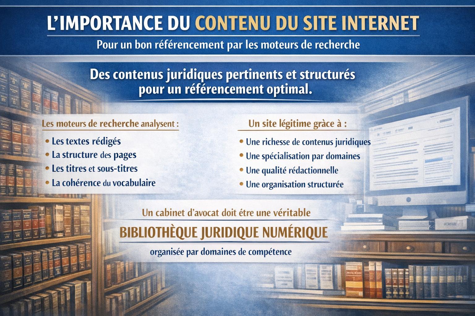 L’importance du contenu du site internet est également fondamentale pour une bonne indexation par les moteurs de recherche. Un site internet ne peut être correctement référencé que s’il contient des textes structurés, rédigés autour de thématiques juridiques précises, intégrant naturellement les mots et les phrases clés identifiés. Les moteurs de recherche analysent les textes, la structure des pages, les titres, les sous-titres, la cohérence du vocabulaire et la spécialisation du contenu. Plus un site contient de contenus juridiques pertinents et structurés, plus il est considéré comme légitime et pertinent par les moteurs de recherche. Le référencement ne repose donc pas uniquement sur la technique informatique, mais avant tout sur la qualité rédactionnelle et la structuration intellectuelle du site. Un site d’avocat doit être pensé comme une véritable bibliothèque juridique numérique organisée par domaines de compétence.