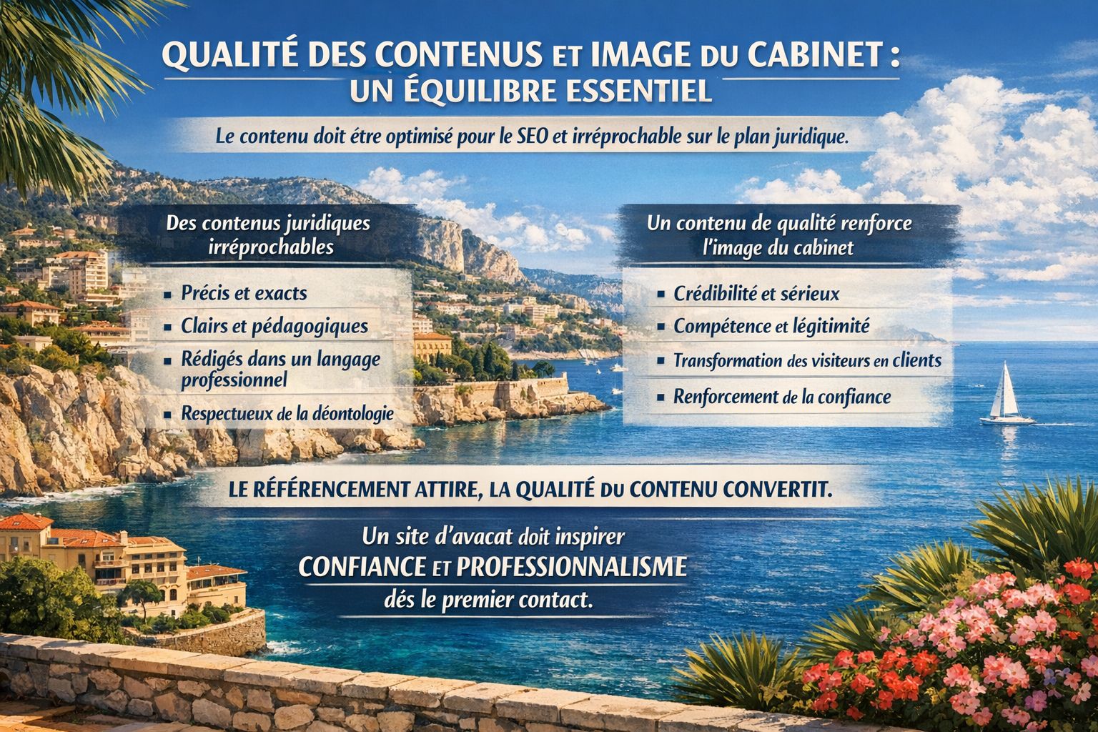 Il est également essentiel que les contenus du site soient juridiquement irréprochables. Le référencement ne doit jamais se faire au détriment de la rigueur juridique ou de l’image du cabinet. Le site internet constitue souvent le premier contact entre le client et l’avocat ; il participe donc directement à l’image de marque du cabinet. Des textes imprécis, approximatifs ou rédigés dans un style trop commercial peuvent nuire à la crédibilité du cabinet. À l’inverse, des contenus clairs, pédagogiques, juridiquement exacts et rédigés dans un langage professionnel renforcent immédiatement l’image de sérieux, de compétence et de légitimité. Le référencement et l’image de marque sont donc étroitement liés : un bon référencement attire les visiteurs, mais la qualité juridique des contenus transforme ces visiteurs en clients. Le contenu doit donc être à la fois optimisé pour les moteurs de recherche et irréprochable sur le plan juridique.