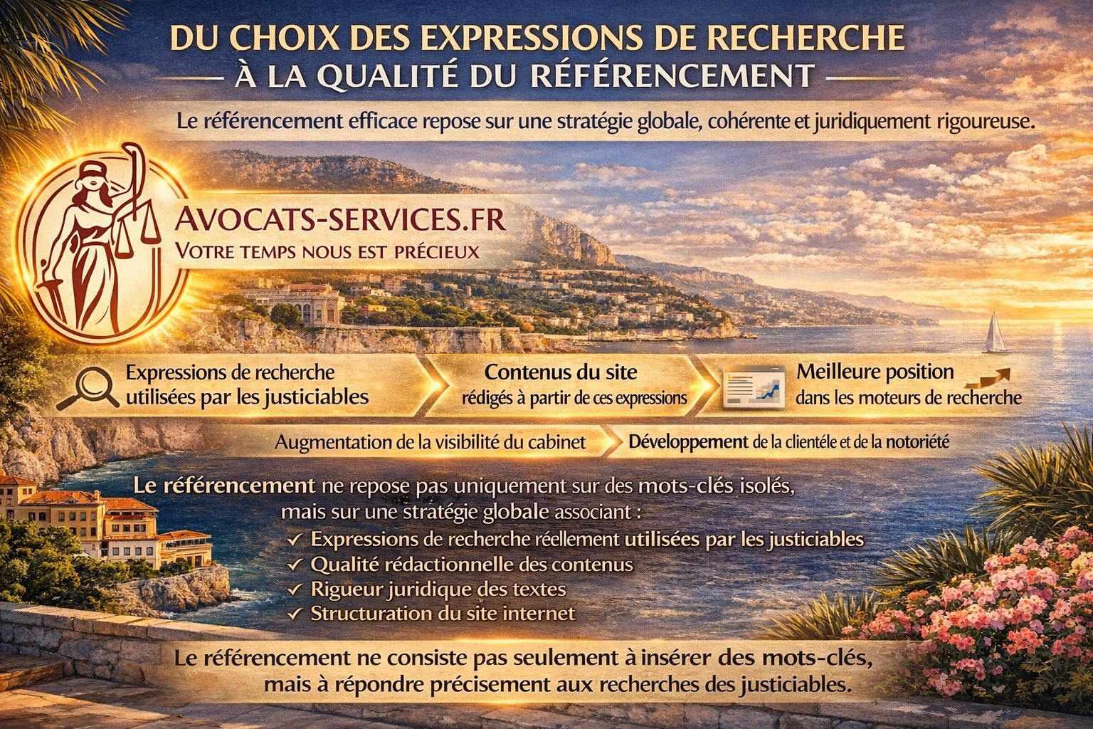 En définitive, il existe un lien direct entre le choix des bons mots et phrases de recherche et la qualité du référencement d’un cabinet d’avocats. Lorsque les contenus du site reprennent précisément les expressions utilisées par les justiciables, les moteurs de recherche comprennent que le site répond exactement aux questions posées par les internautes. Le site apparaît alors plus haut dans les résultats de recherche, ce qui augmente sa visibilité. Plus la visibilité augmente, plus le nombre de visiteurs progresse, et plus la notoriété du cabinet se développe. Le référencement devient alors mesurable, car il se traduit par une augmentation du trafic sur le site, des demandes de contact et des nouveaux dossiers. Ainsi, le référencement ne repose pas seulement sur des mots-clés isolés, mais sur une stratégie globale associant expressions de recherche, qualité rédactionnelle, rigueur juridique et structuration du site. C’est cette cohérence entre les mots recherchés par les clients et les contenus publiés par le cabinet qui permet d’obtenir un référencement réellement efficace et durable.